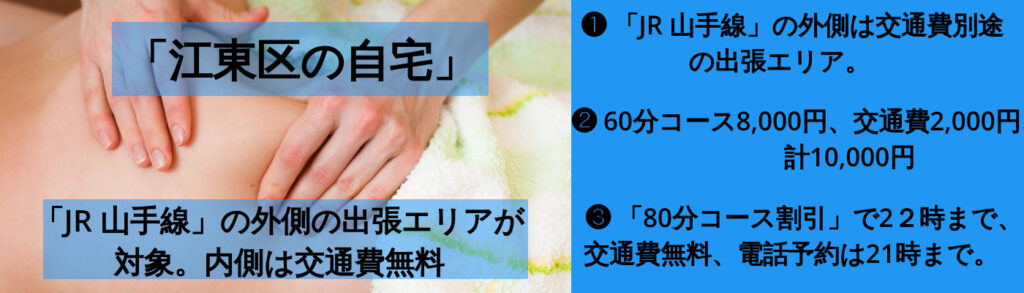 当店の出張マッサージの、出張エリアの中で、「江東区の自宅:交通費別途」について紹介しています。