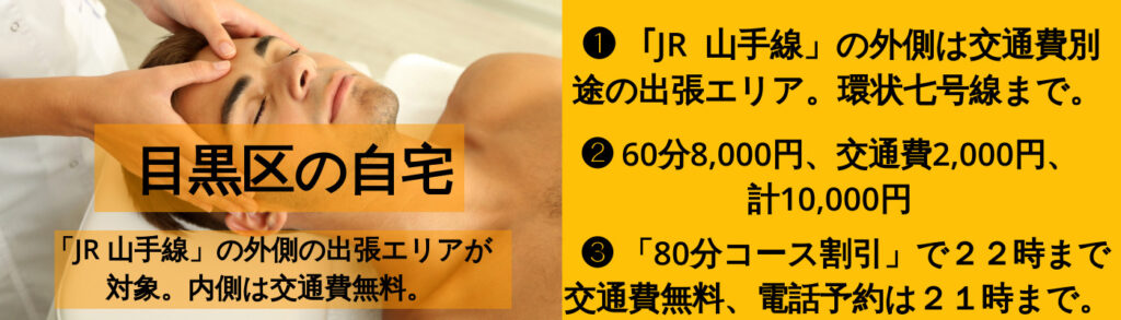 当店の出張マッサージの、出張エリアの中で、「目黒区の自宅:交通費別途」について紹介しています。