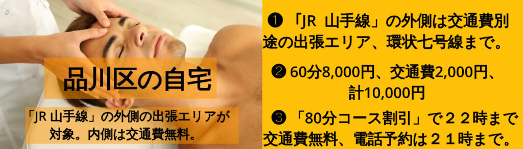 当店の出張マッサージの、出張エリアの中で、「品川区の自宅:交通費別途」について紹介しています。