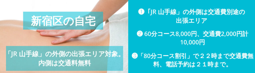 当店の出張マッサージの、出張エリアの中で、「新宿区の自宅:交通費別途」について紹介しています。