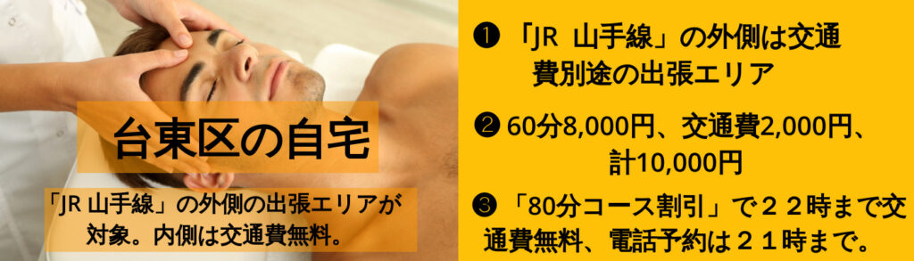 当店の出張マッサージの、出張エリアの中で、「台東区の自宅:交通費別途」について紹介しています。
