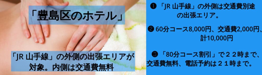 「交通費別途エリア」 通常の「キャンペーン」は交通費無料の出張エリア(=「JR山手線」の内側)、限定ですが「交通費別途エリアで交通費無料になる割引」を現在、実施中です。下記より参照ください。 「豊島区のホテル:交通費別途」では、利用になれません。 |