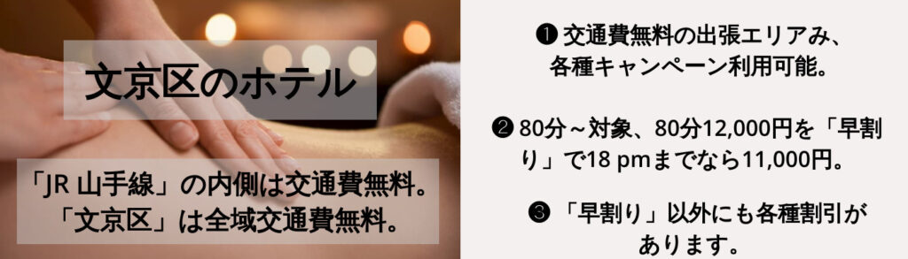 「交通費別途エリア」 通常の「キャンペーン」は交通費無料の出張エリア(=「JR山手線」の内側)、限定ですが「交通費別途エリアで交通費無料になる割引」を現在、実施中です。下記より参照ください。 「文京区のホテル」の「ホテル椿山荘東京」は、交通費無料です。 |
