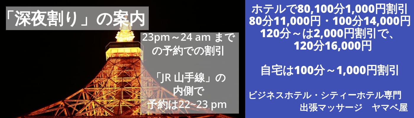 「ビジネスホテル・シティーホテル専門」出張マッサージのヤマベ屋(都心部は自宅も可)は東京都心部のホテル・自宅へ、リーズナブルで、廉価かつ高いスキルで高品質な出張マッサージを提供。