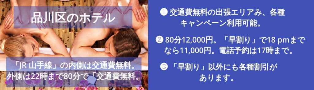 ⑴ 「品川区のホテル、ドシー五反田」では通常、交通費無料「60分コース8,000円」