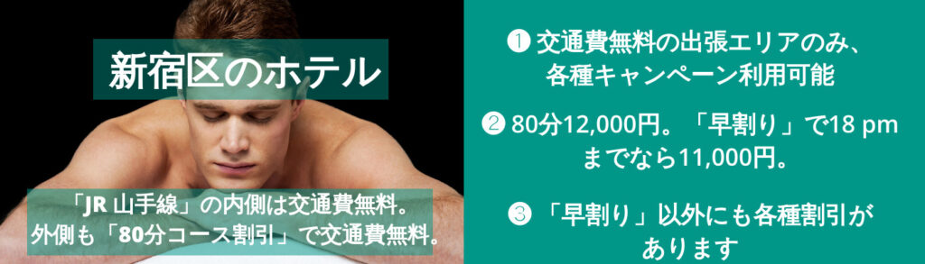 ⑴ 「新宿区のホテル、新宿プリンスホテル」では通常、交通費無料「60分コース8,000円」