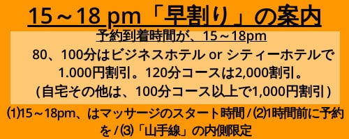| ① 早割り 15~18時 | ホテルは80分、100分は~1,000円割引、120分は2,000円割引/自宅は100分コース以上、1,000円割引。 | 17時で電話受付終了/到着までに1時間程度・前日予約有り |