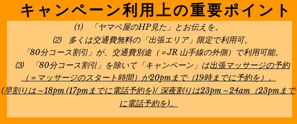 ⑷ 「キャンペーン」は出張マッサージの予約(=マッサージのスタート時間)が20pmまでです(下記④の「深夜割り」は23時まで電話予約を。また、下記⑩の「80分コース割引」は21時までの電話予約を)、早目のご予約を。前日予約もOK。