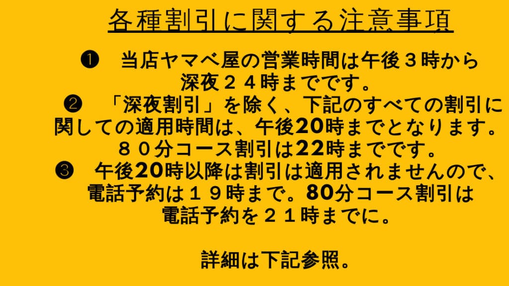 ⑻ 他の割引と異なり、「深夜割り」は例外で、24時迄割引可、電話予約は23pmまで(通常割引は20時まで)。